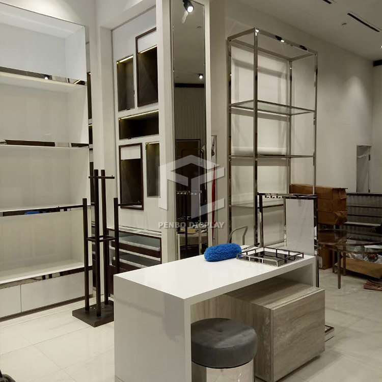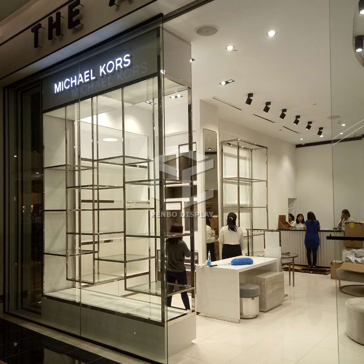Pracowaliśmy ze znaną marką na całym świecie: Michael Kors. Głównymi materiałami są stal nierdzewna i MDF. Stal nierdzewna jest specjalna dla niektórych wysokiej klasy gabloty wystawowej. MDF może malować dowolny kolor i tworzyć dowolny kształt. Łatwiej jest to osiągnąć ekskluzywny wygląd
